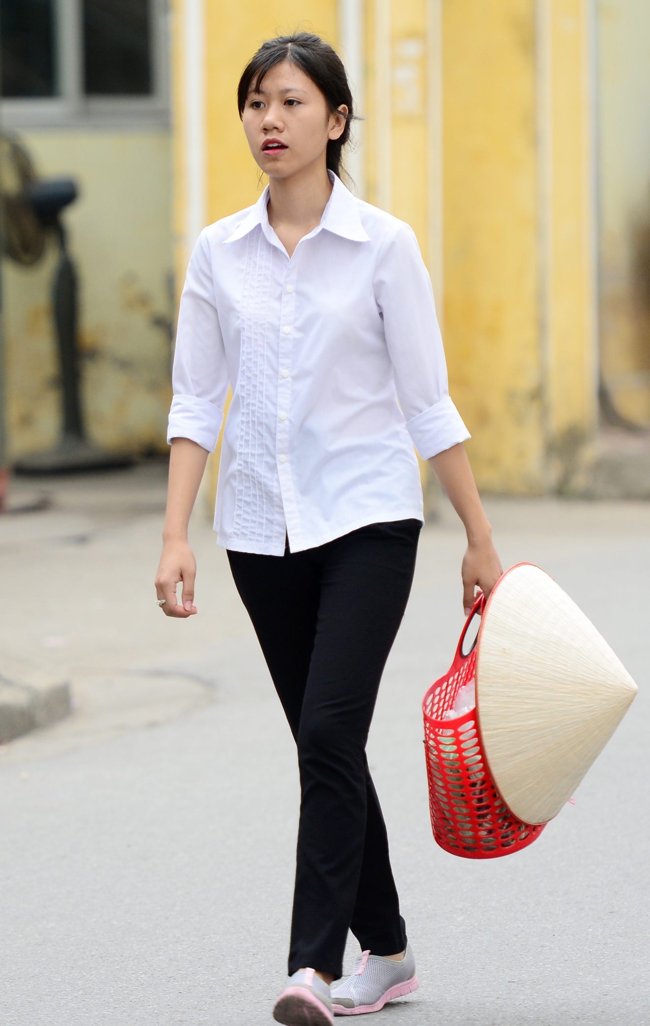 | Là trường đào tạo các ngành học đặc thù, ĐH Sân Khấu Điện ảnh Hà Nội cho phép thí sinh mang đạo cụ phục vụ các tiết mục, tiểu phẩm dự thi. Thí sinh Đặng Ngọc Ánh (đến từ Thái Bình) chuẩn bị sẵn làn nhựa, nón lá trước khi vào phòng. Ánh tập và chuẩn bị cho tiểu phẩm của mình trong một tuần. |