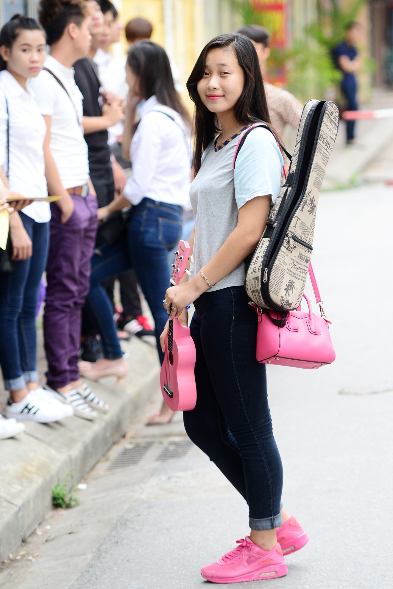 Sáng 21/7, hơn 100 thí sinh dự thi năng khiếu Diễn viên kịch - Điện ảnh, ĐH Sân khấu Điện ảnh Hà Nội. Có người mang theo đàn, làn nhựa, chổi quét nhà, nón lá làm đạo cụ diễn xuất.