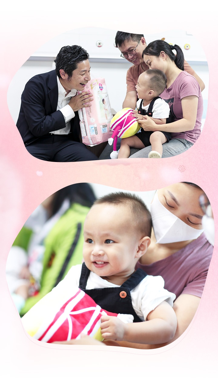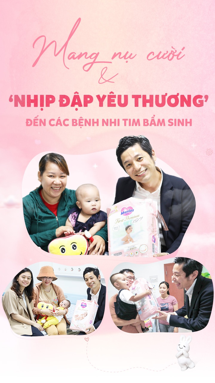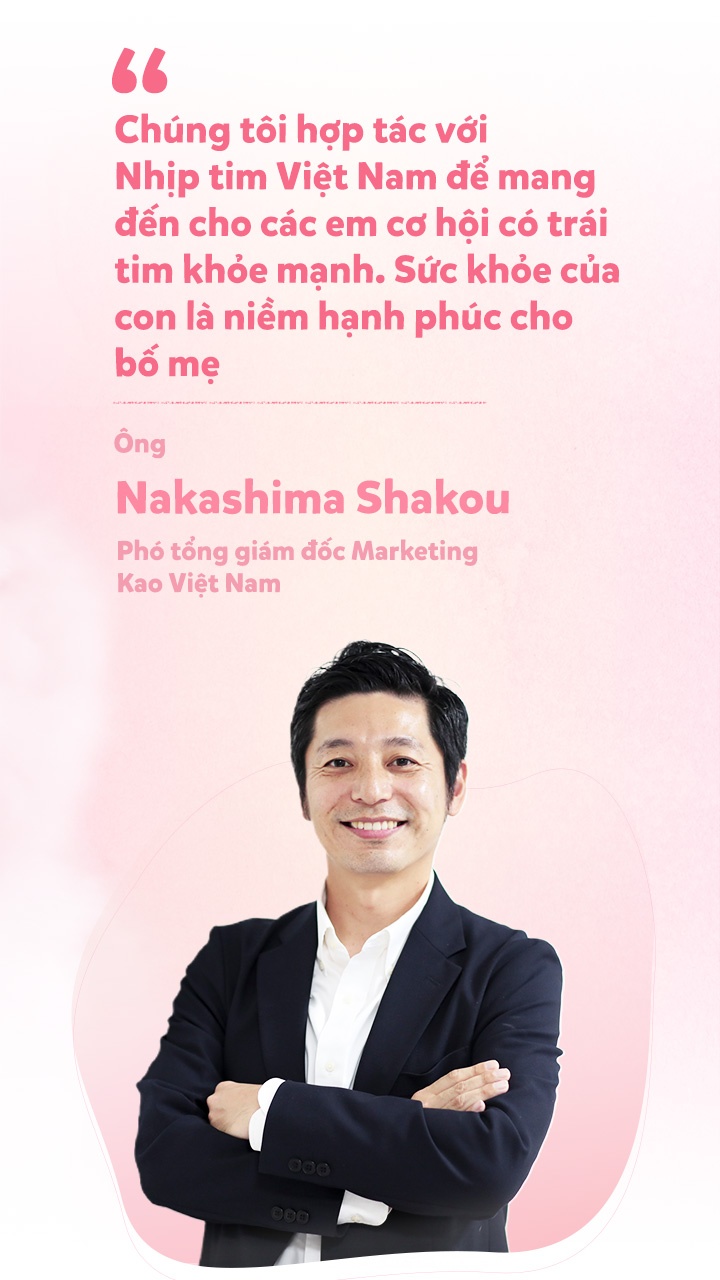 Có mặt trong buổi ghé thăm các bé sau phẫu thuật, ông Nakashima Shakou - Phó tổng giám đốc Marketing Kao Việt Nam, chia sẻ: “Chiến dịch ‘Mang niềm vui ngập tràn tới ngàn trái tim Việt’ có ý nghĩa quan trọng với Merries nói riêng và Kao Việt Nam nói chung. Đây là chương trình chào mừng sinh nhật Merries 40 năm. Với mỗi gói tã Merries chính hãng bố mẹ mua, Merries sẽ thay mặt đóng góp 4.000 đồng vào Nhịp tim Việt Nam và gửi niềm vui đến các em nhỏ mắc bệnh tim tại Việt Nam”.