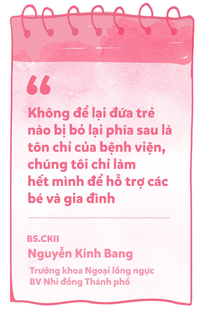Khi được hỏi về câu nói “sẽ không có đứa trẻ nào bị bỏ lại phía sau” mà nhiều phụ huynh hay nhắc đến, vị Trưởng khoa Ngoại lồng ngực chỉ nhẹ nhàng chia sẻ: “Đây là tôn chỉ của bệnh viện, chúng tôi làm hết mình để hỗ trợ các bé và gia đình”.