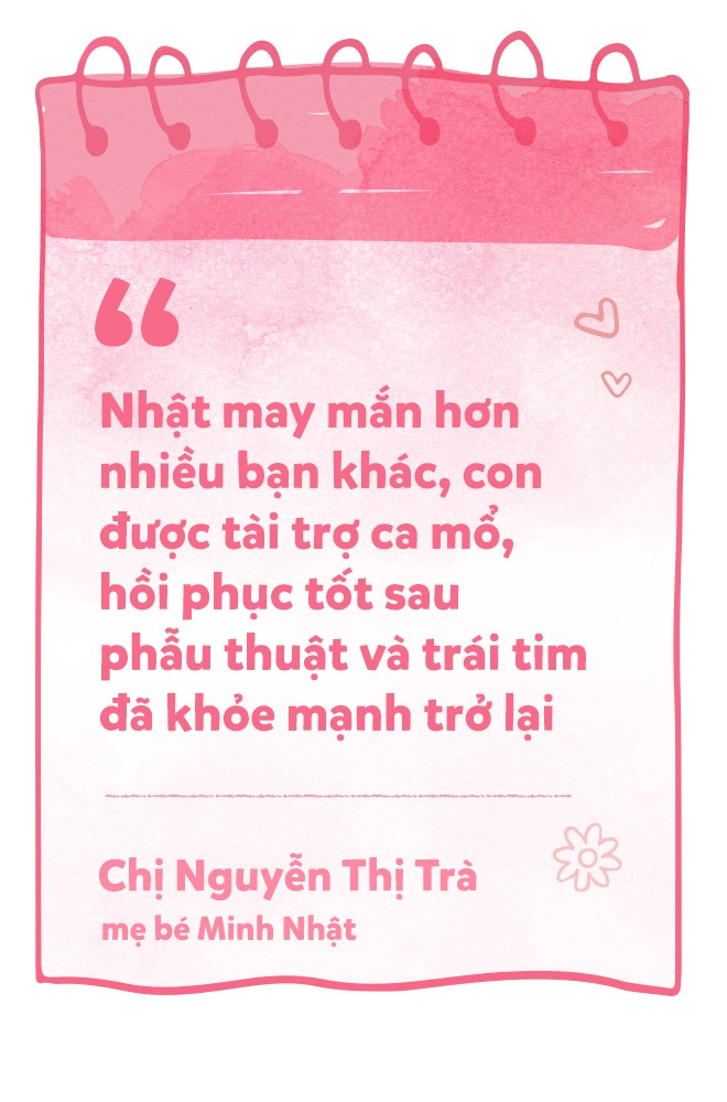 Thế rồi như trường hợp của Bảo Ngọc, chi phí ca phẫu thuật cho Minh Nhật được Merries Việt Nam và Nhịp tim Việt Nam tài trợ. Bố mẹ em bớt phần nào gánh nặng. Cậu bé phẫu thuật thành công và được xuất viện sau 2 tuần.