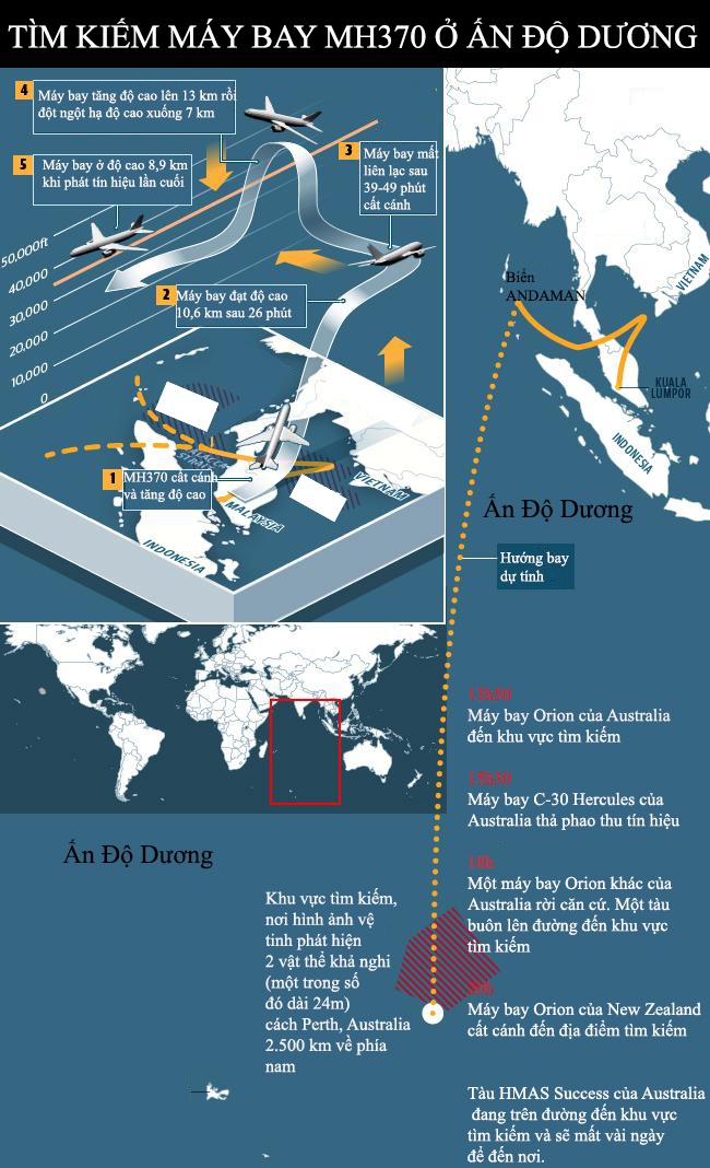 Trước đó, khi phát biểu trước quốc hội Australia, Thủ tướng Tony Abbott cho hay Cơ quan An toàn Hàng hải Australia (AMSA) nhận được thông tin dựa trên hình ảnh vệ tinh về hai vật thể lạ, nghi là mảnh vỡ từ máy bay Boeing 777 ở vùng biển ngoài khơi Perth, phía tây Australia.