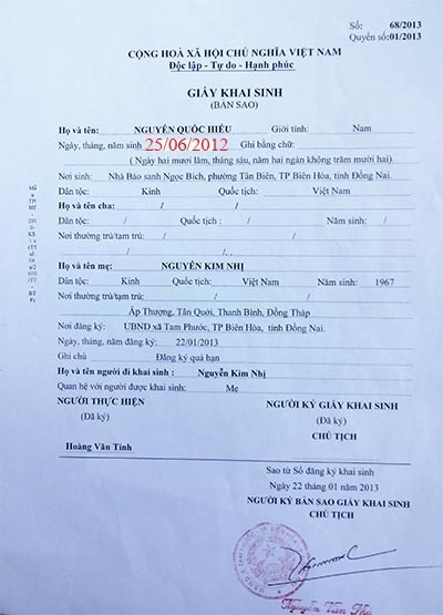 Trở lại xã Tam Phước để xin tiếp cận hồ sơ gốc của hồ sơ đăng ký khai sinh cho các cháu, ông Trần Thanh Bạch (Phó Chủ tịch UBND xã Tam Phước) lại cung cấp thông tin khác với ông Tỉnh. Theo ông Bạch, khi đi đăng ký, bà Nguyễn Kim Nhị khai đó là con ruột của mình và cung cấp giấy chứng sinh do nhà bảo sinh tư nhân Ngọc Bích cấp cùng giấy đăng ký tạm trú có thời hạn. Theo quy định, với hai loại giấy tờ trên thì đủ điều kiện để cấp giấy khai sinh cho Khánh, Hiếu và Hằng.