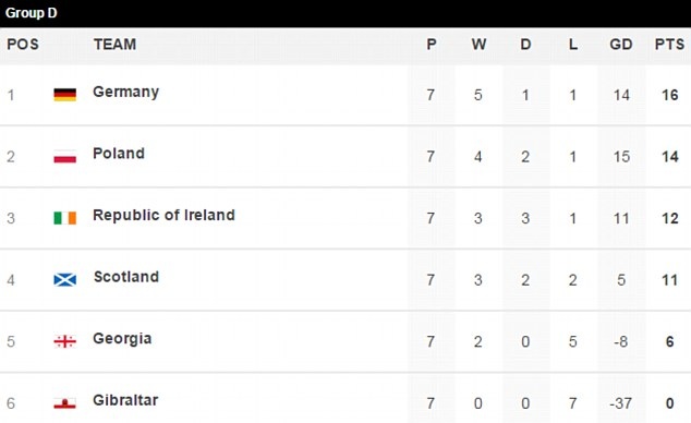 Vị trí của các đội tuyển ở bảng D vòng loại EURO 2016. ĐT Đức dẫn đầu với 16 điểm cùng hiệu số +14.