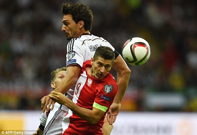 Tiền đạo Lewandowski nỗ lực thi đấu, nhưng không thể tạo ra khó khăn cho hàng phòng ngự của ĐT Đức dưới sự chỉ huy của Mats Hummels.