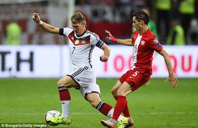 Tiền vệ Schweinsteiger thuộc biên chế M.U mang băng thủ quân của ĐT Đức ở trận gặp ĐT Ba Lan.