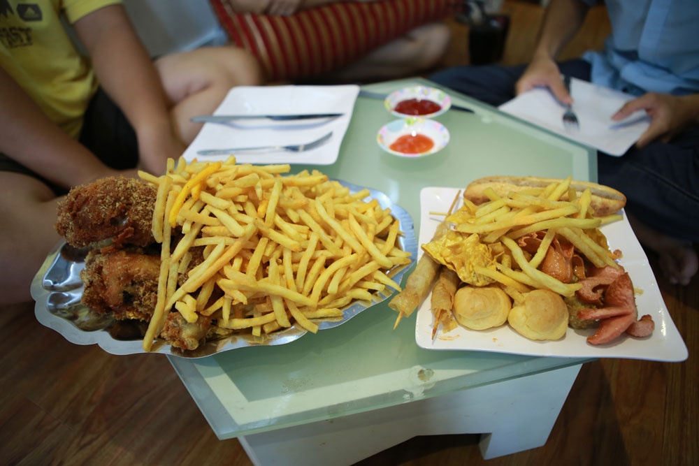 | Nếu ăn hết 4 đùi gà chiên giòn, 0,5 kg khoai tây lắc phô mai và 2 cốc Coca trong 15 phút, và sử dụng dao, dĩa, cặp đôi sẽ được giải thưởng 1 triệu đồng. Ảnh: Phan Anh. |
