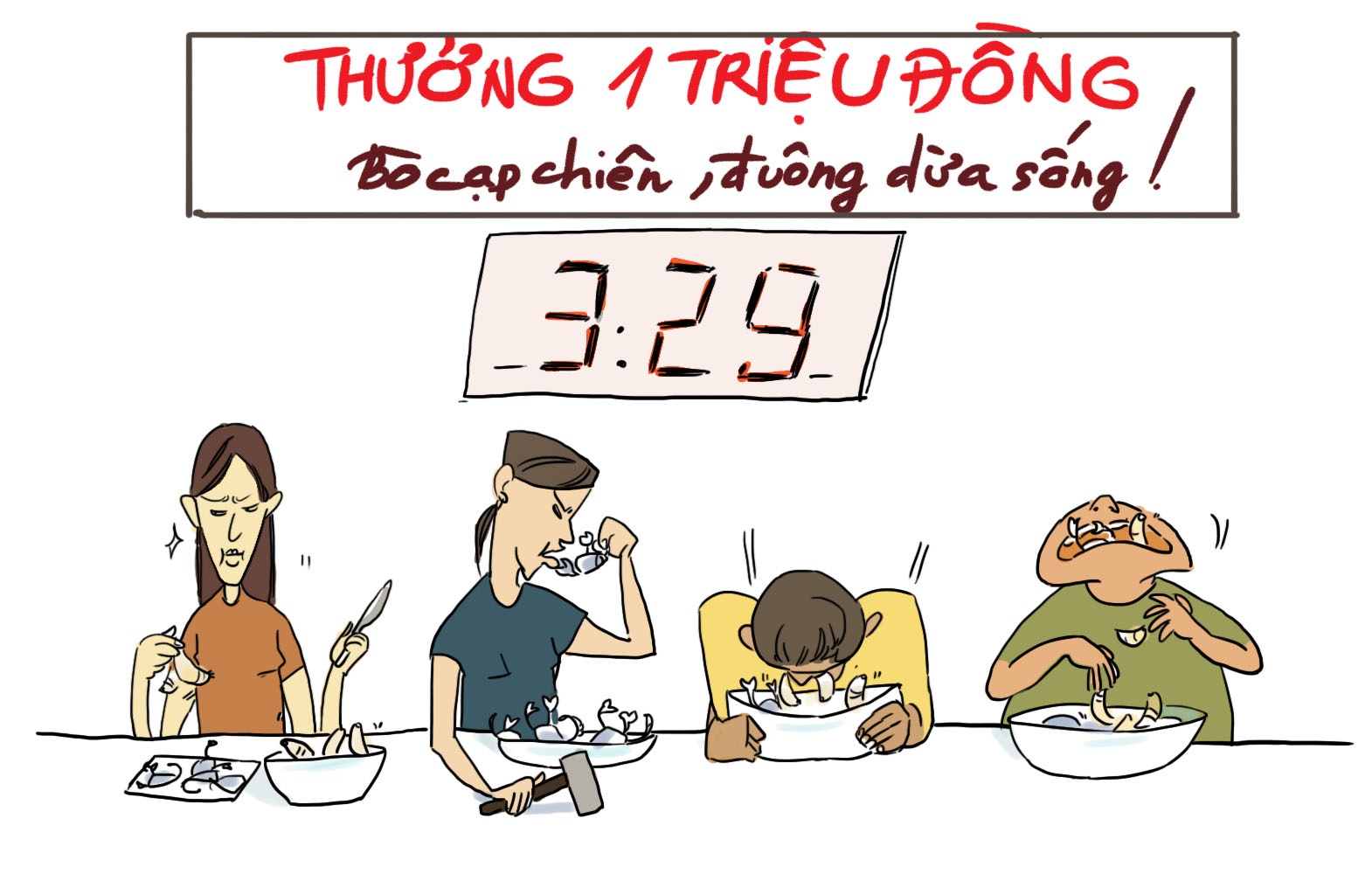 Thử thách với khách hàng nhất là cuộc thi ăn côn trùng của một nhà hàng ở TP HCM. Khách cũng sẽ được thưởng 1 triệu đồng nếu ăn hết 20 con bọ cạp chiên giòn, 5 con đuông dừa sống trong thời gian 5 phút. Người tham gia nếu thua sẽ phải trả phí 250.000 đồng. Cuộc thi thu hút khá động người tham gia, song phần lớn khách đầu hàng khi nhìn những con đuông dừa sống "bơi" trong chén nước chấm. |