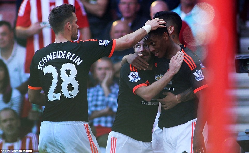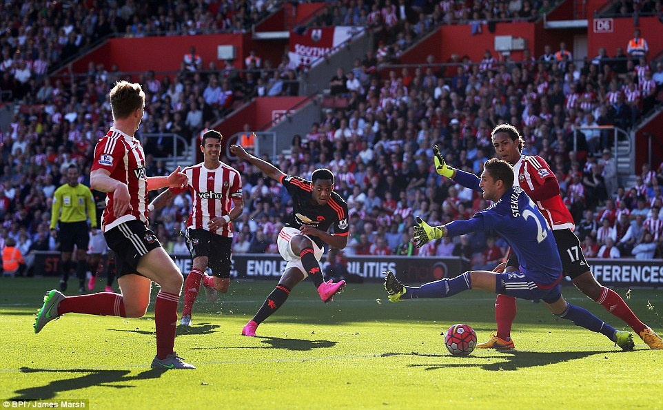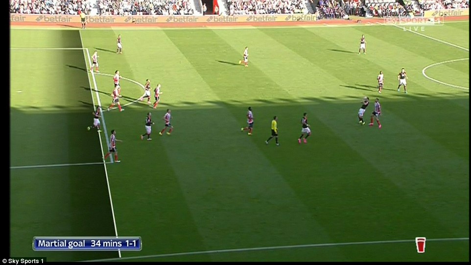 | Kênh truyền hình Sky Sports cho rằng Juan Mata đã rơi vào thế việt vị trong pha bóng Martial lập công. Pha quay chậm cho thấy tiền vệ người Tây Ban Nha đứng dưới hậu vệ cuối cùng của Southampton. |