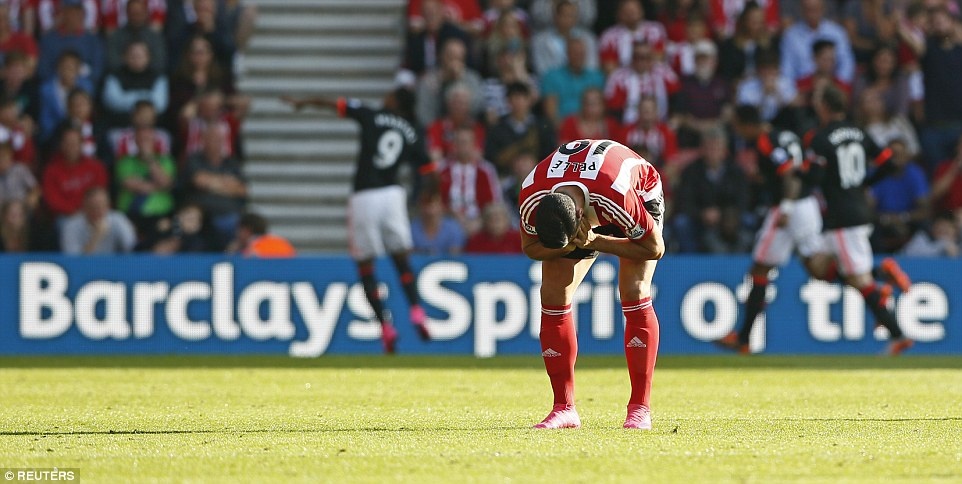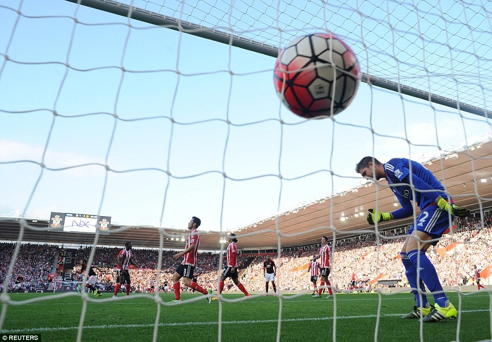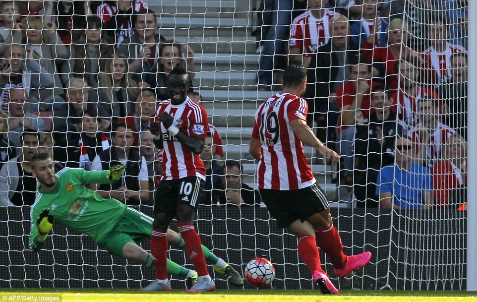 | Pelle giúp Southampton vươn lên dẫn trước phút 13. Trong tình huống này, De Gea xuất sắc truy cản cú đệm bóng của Mane. Tuy nhiên, cú sút bồi sau đó của Pelle không cho thủ thành người Tây Ban Nha cơ hội cản phá. |