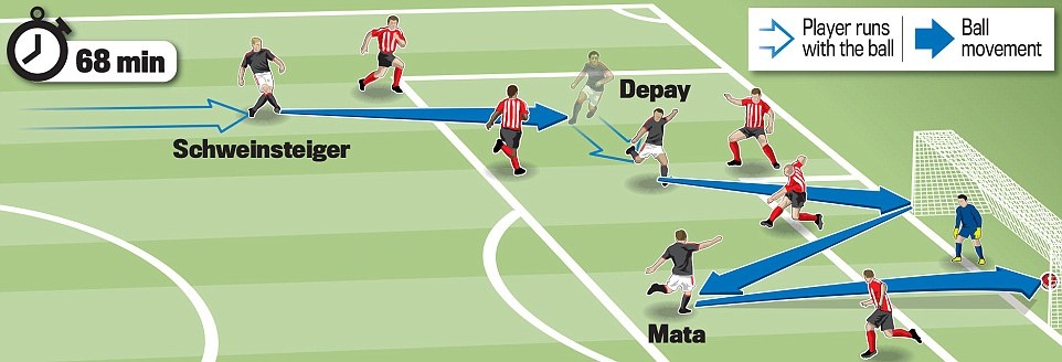 | Bastian Schweinteiger là người châm ngòi. Tiền vệ người Đức chuyền bóng để Depay sút dội cột. |