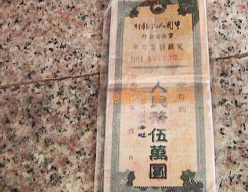 | Cuốn sổ tiết kiệm 50.000 nhân dân tệ của cụ bà. Ảnh: SCMP |