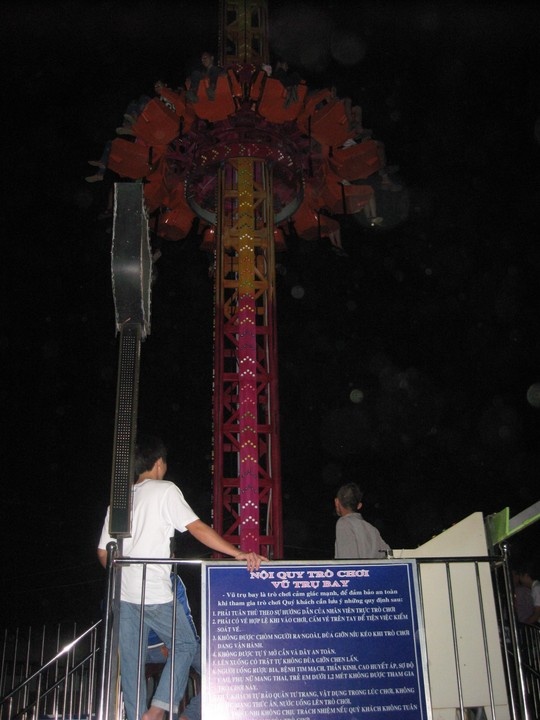 Còn tại trò chơi đu quay đứng, thời điểm mất điện có trên 30 người bị treo trong những chiếc lồng sắt lơ lửng trên cao. Nhiều người hoảng loạn cầu cứu, nhân viên quản lý trò chơi phải leo lên đu quay trấn an mọi người bình tĩnh.