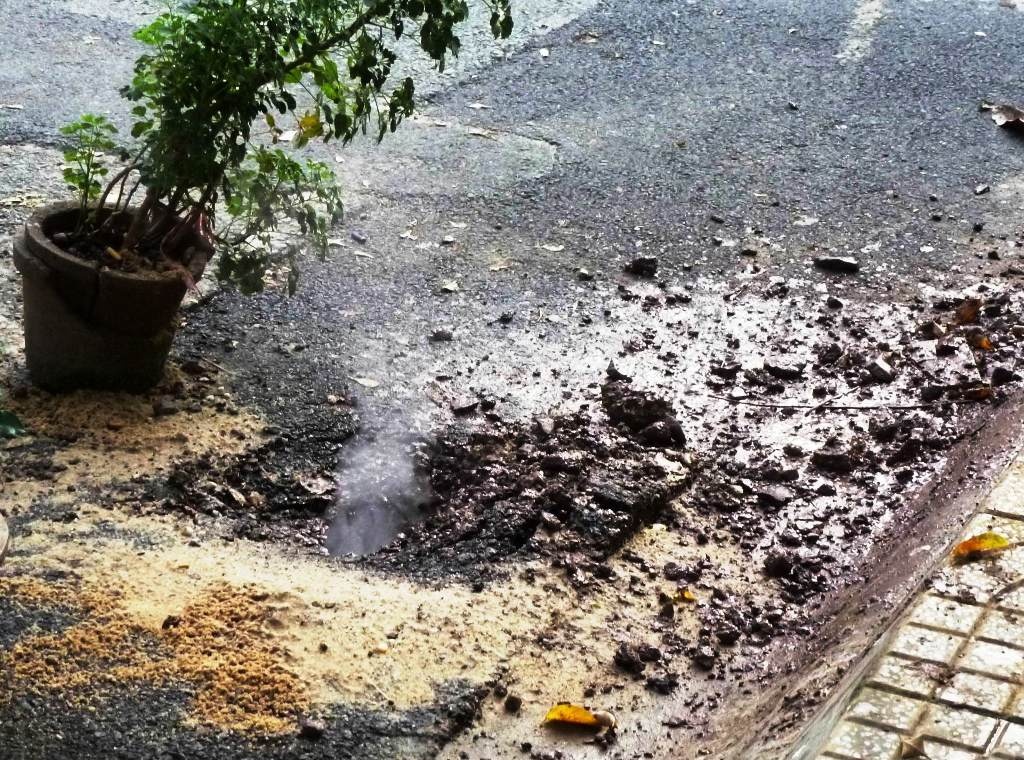 | Ghi nhận tại hiện trường, miệng hố sụt sâu khoảng 30cm. Ở hố này liên tục xuất hiện những tiếng nổ “bụp bụp” không quá lớn, kèm theo luồn khói khi màu trắng, khi màu hồng. Khi hết nổ, lượng nước có trong hố tự nhiên sôi lên sùng sục. |