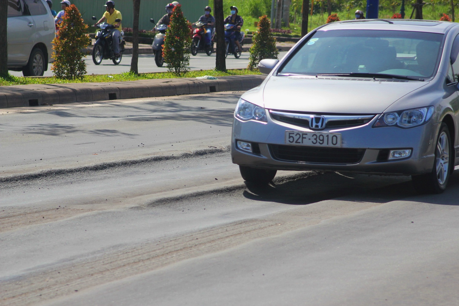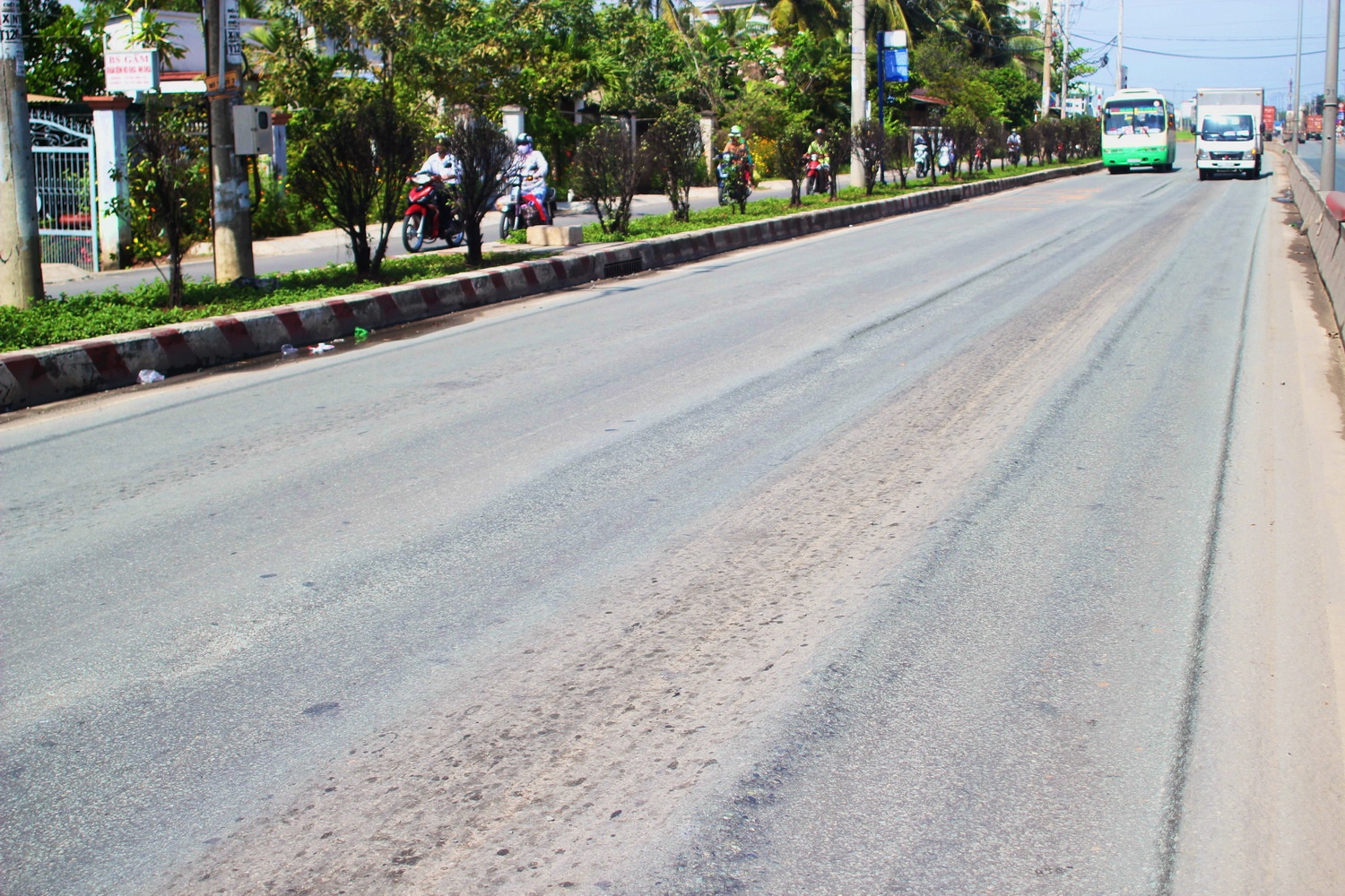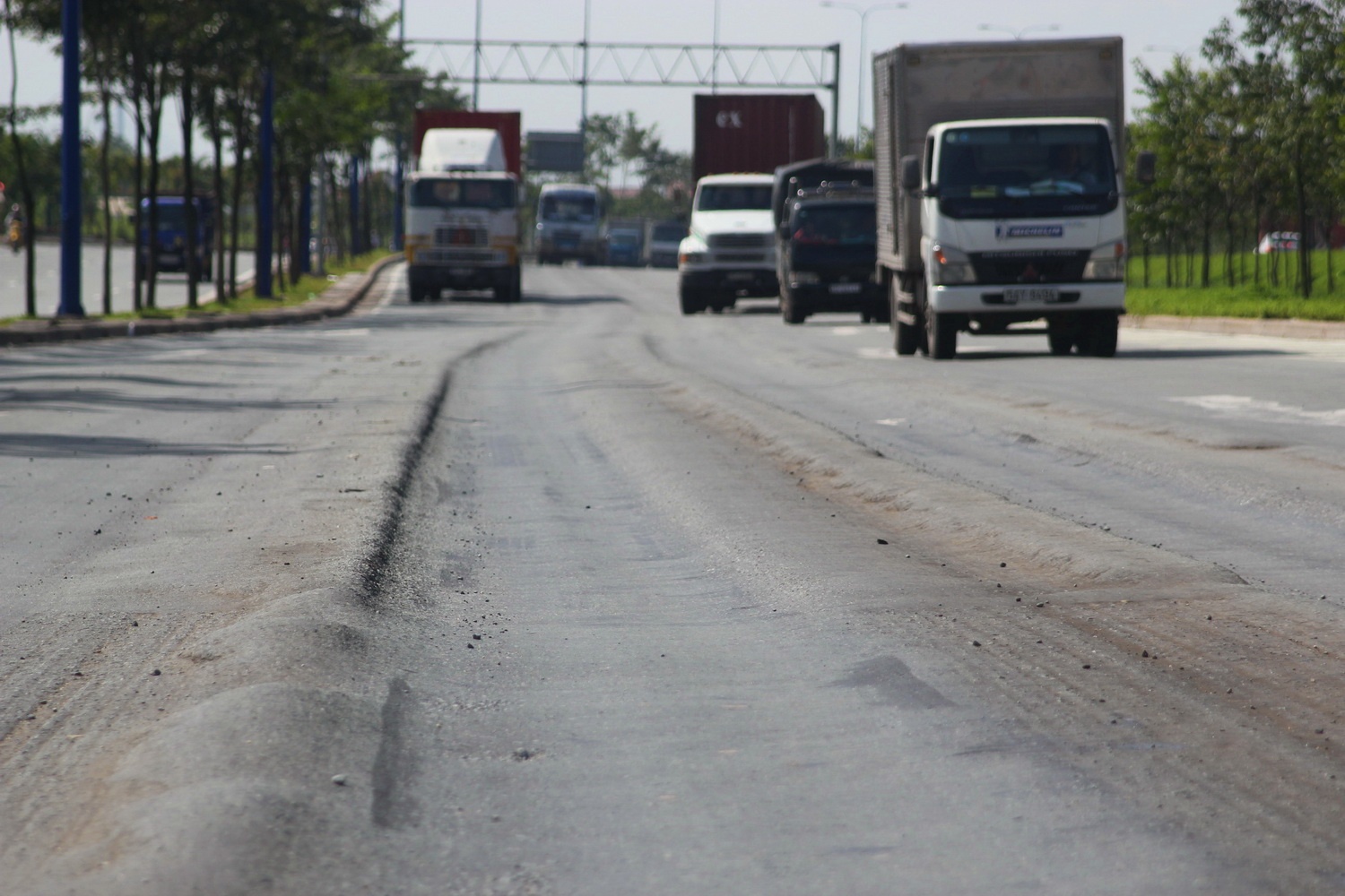 | Từng lớp bê-tông nhựa trồi lên, lỏm xuống khiến mặt đường nham nhở và xấu xí. |