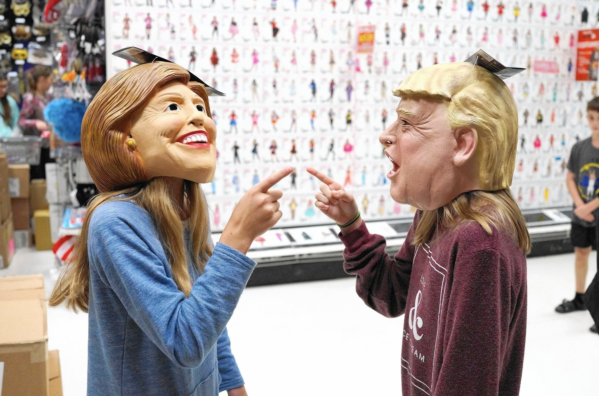 Nhiều người chán nản với cuộc bầu cử năm nay nói rằng họ sẽ mua mặt nạ của Trump và Clinton về để diễn lại những màn tranh luận của hai ứng viên. Cuộc tranh luận của ông Trump và bà Clinton, đáng ra phải tập trung vào các chính sách, thường bị đẩy về những cáo buộc đời tư của nhau. Ảnh:
