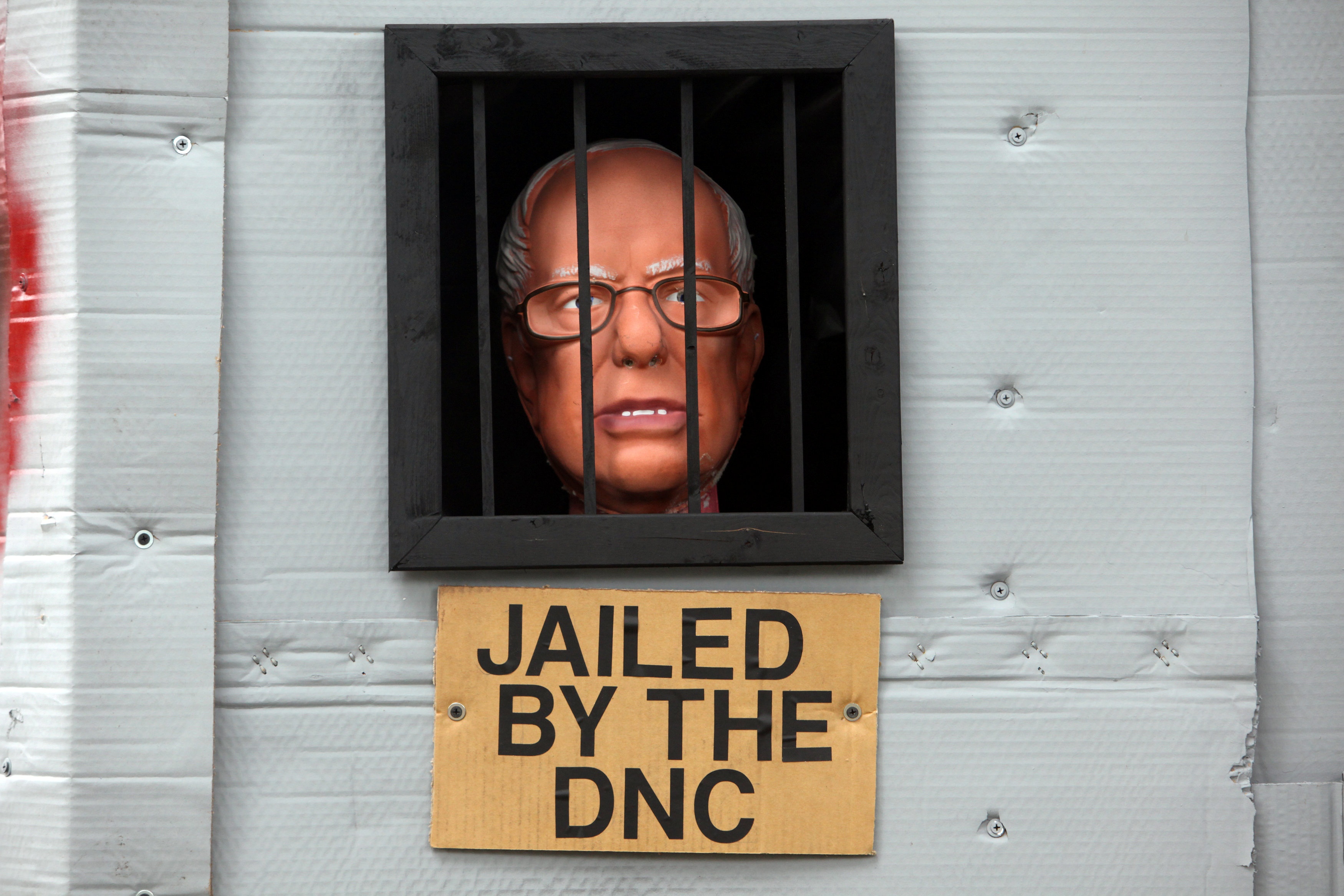 Hình nộm thượng nghị sĩ Bernie Sanders bị Ủy ban Quốc gia đảng Dân chủ Mỹ (DNC) giam cầm. Hồi tháng 7, các tài liệu WikiLeaks công bố cho thấy nhiều đảng viên đảng Dân chủ muốn gây sức ép, đẩy ông Sanders khỏi cuộc đua vào Nhà Trắng để bà Clinton thuận lợi trở thành người đại diện đảng Dân chủ tranh cử tổng thống Mỹ. Ảnh: Reuters.