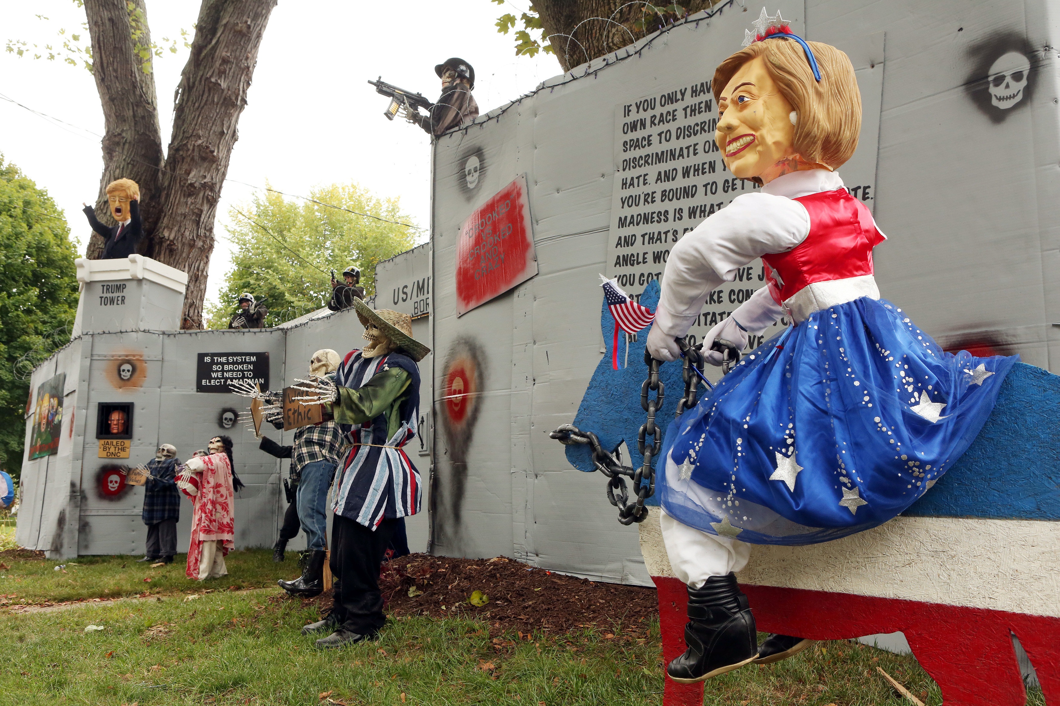 Một ngôi nhà ở bang Connecticut trang trí Halloween bằng hình ảnh ông Trump đứng trên tòa tháp Trump nổi tiếng của mình. Bao quanh tòa tháp là bức tường biên giới mà ông tuyên bố sẽ xây để ngăn người Mexico tràn qua Mỹ. Ảnh: Reuters.
