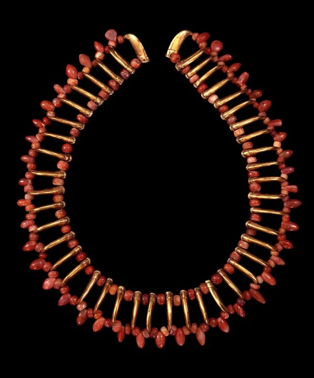 | Vòng cổ gồm những viên đá quý màu đỏ và móng vuốt bằng vàng có từ năm 900 đến 1600. |