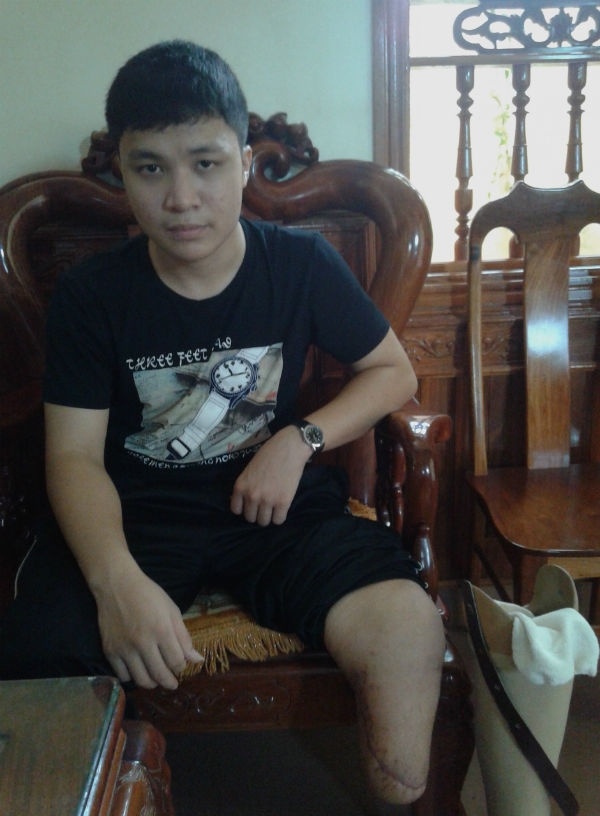 | Em Nguyễn Thế Thức đã phải lắp chân giả để đi lại. Hơn 1 tháng qua em đã phải nhờ bố chở đi học. |