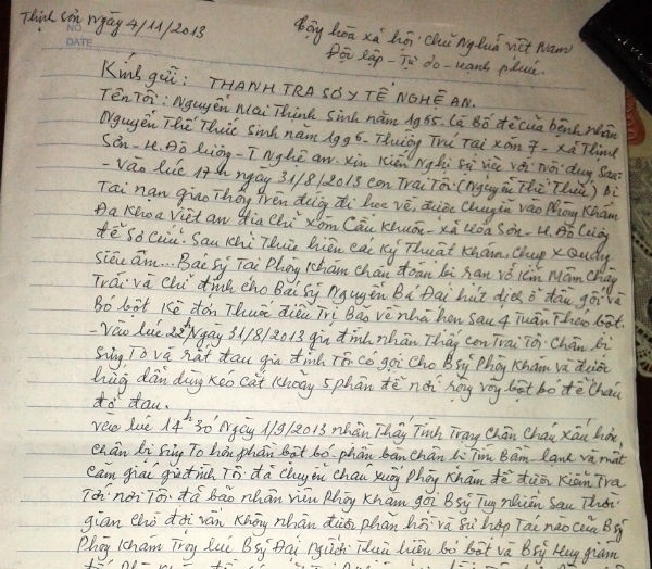 | Đơn tố cáo của gia đình gửi Sở Y tế Nghệ An và các đơn vị chức năng. |