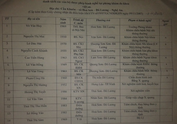 Đặc biệt, theo thông tin từ Phòng Quản lý ngành nghề Y dược, Sở Y tế Nghệ An, giấy phép hoạt động của PKĐK Việt An đã hết hạn hơn 1 năm (từ tháng 11/2012). Thế nhưng mọi hoạt động khám chữa bệnh vẫn được tổ chức bình thường trong suốt thời gian qua.