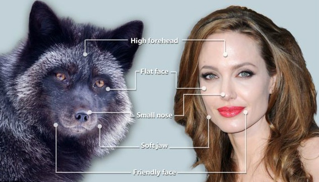 | Khuôn mặt của những phụ nữ xinh đẹp như nữ minh tinh Angelina Jolie có điểm chung với khuôn mặt của những con cáo hiền lành và hòa đồng. Các điểm chung đó bao gồm trán cao, mặt phẳng, mũi nhỏ, hàm nhỏ. Ảnh: Mail Online. |