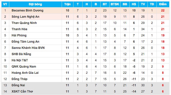 | Bảng xếp hạng V.League tính đến hết ngày 26/4. Ngày 27/4, vòng 11 V.League sẽ diễn ra trận đấu cuối cùng giữa B.Bình Dương - Hải Phòng. |