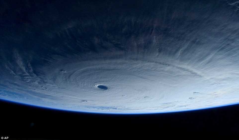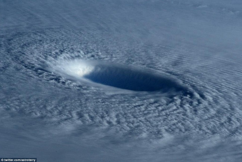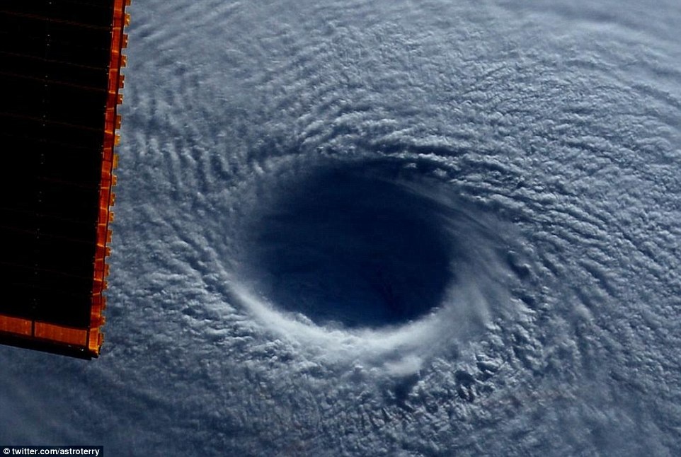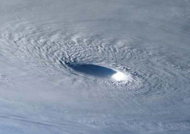 Samantha Cristoforetti, phi hành gia người Italy, mô tả sức tàn phá của cơn bão là khủng khiếp dù họ quan sát nó từ trên quỹ đạo trái đất. Phần mắt bão giống hệt hố đen. Ảnh: NASA |