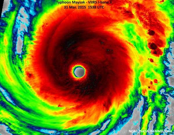 Các vệ tinh thời tiết cũng cho thấy rõ vị trí mắt bão Maysak. Đám mây xung quanh thường được tô màu rất đậm vì chúng chứa lượng nước lớn hoặc có nhiệt độ thấp hơn các khu vực xung quanh. Ảnh: NASA |