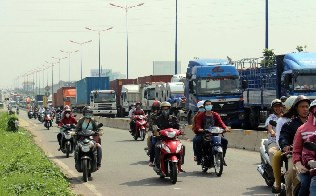 | Xa lộ Hà Nội ùn tắc giao thông kéo dài vì vụ tai nạn do xe tải mất thắng. Ảnh: Trường Nguyên. |