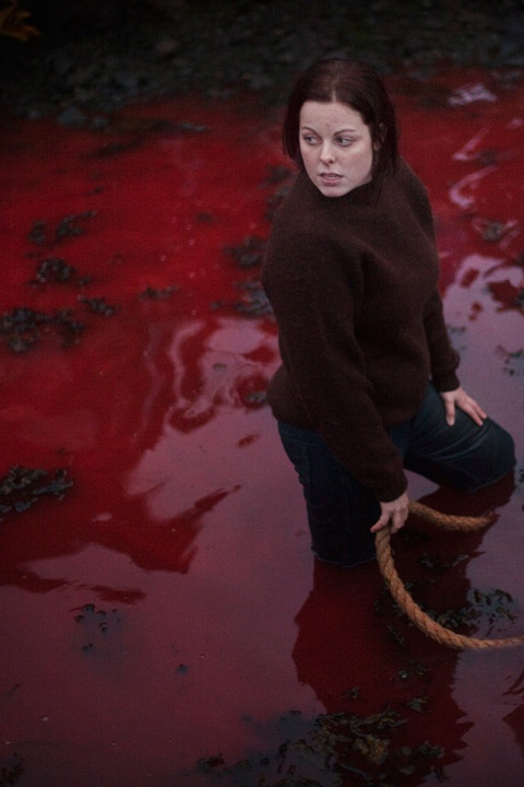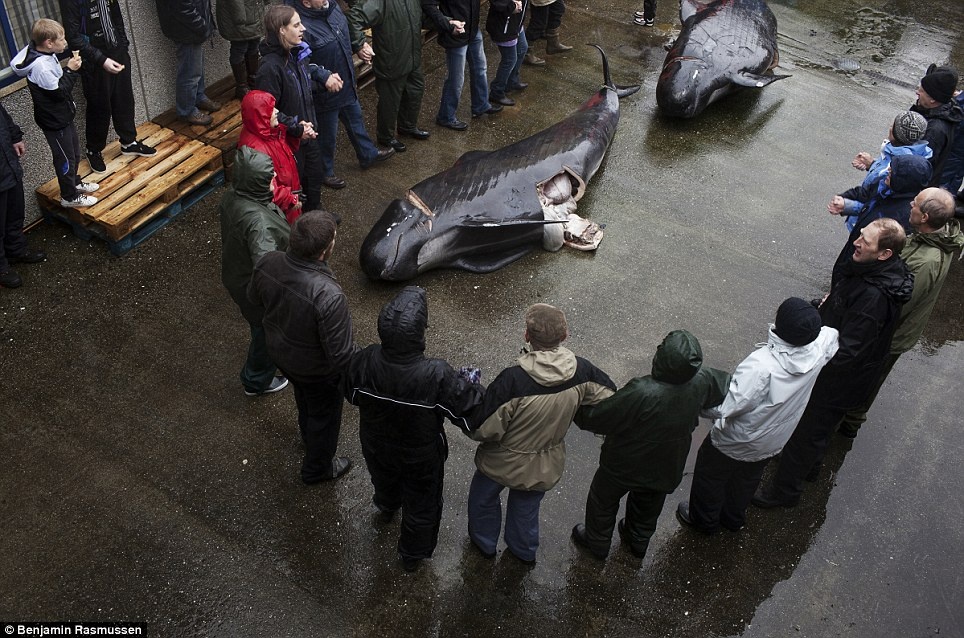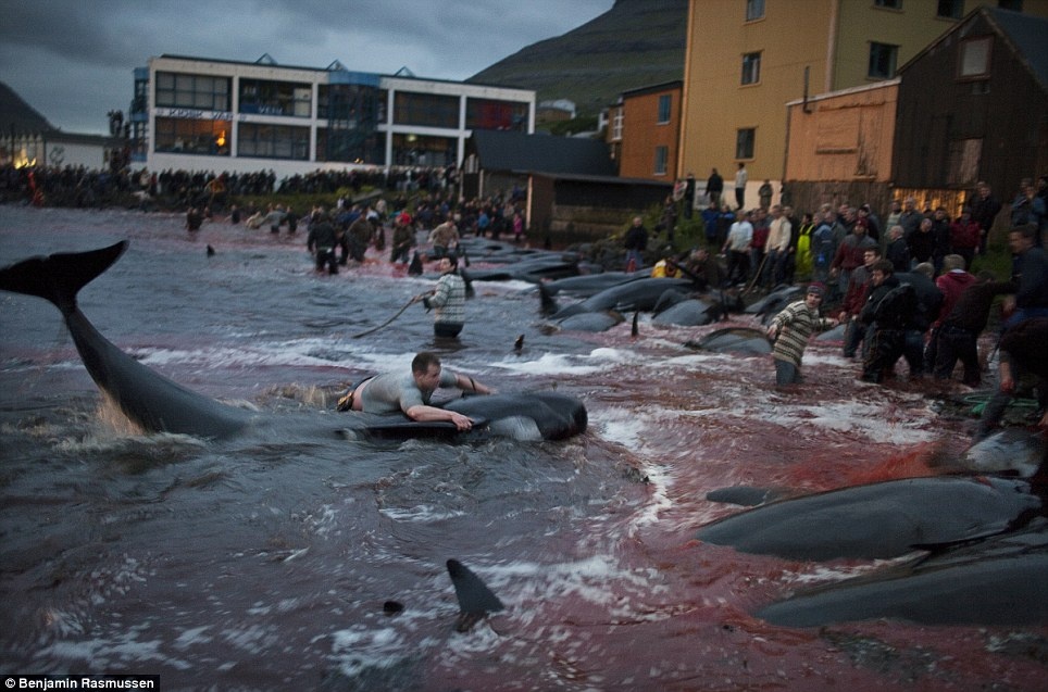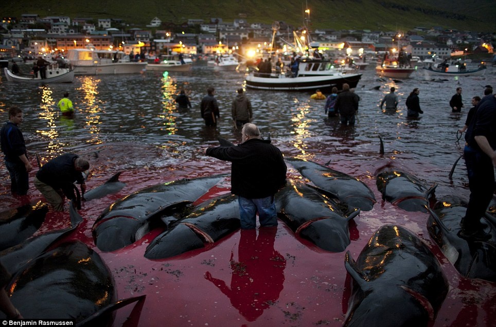 Vào mùa săn cá voi, toàn bộ người dân quần đảo lại lên thuyền để lùa cá vào bờ. Sau cuộc đi săn, thịt và mỡ cá voi được chia đều cho tất cả mọi người. “Khung cảnh hãi hùng, máu chảy loang lổ”, Rasmussen cho biết. Ảnh: Daily Mail. |