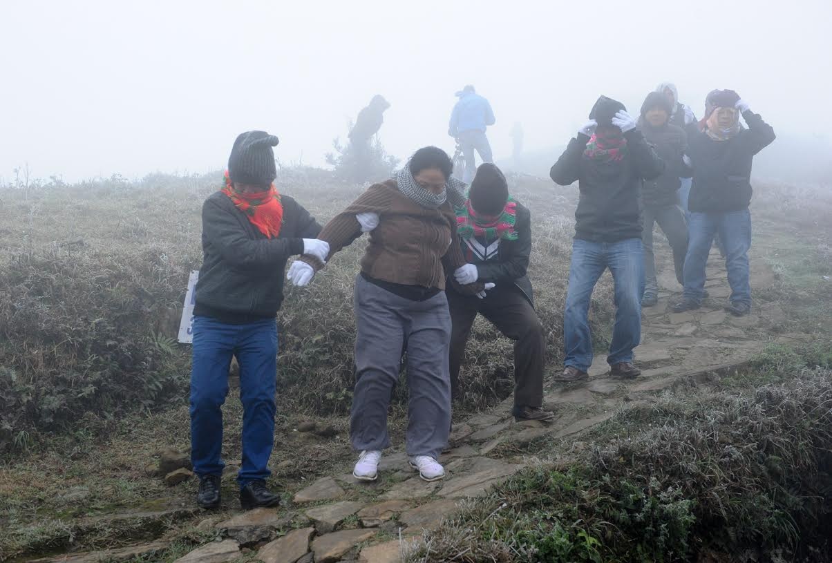 Gió trên đỉnh Mẫu Sơn thổi mạnh nên rất khó đi lại. Một phụ nữ lớn tuổi phải nhờ 2 người dìu đi vì đường dốc rất trơn. |