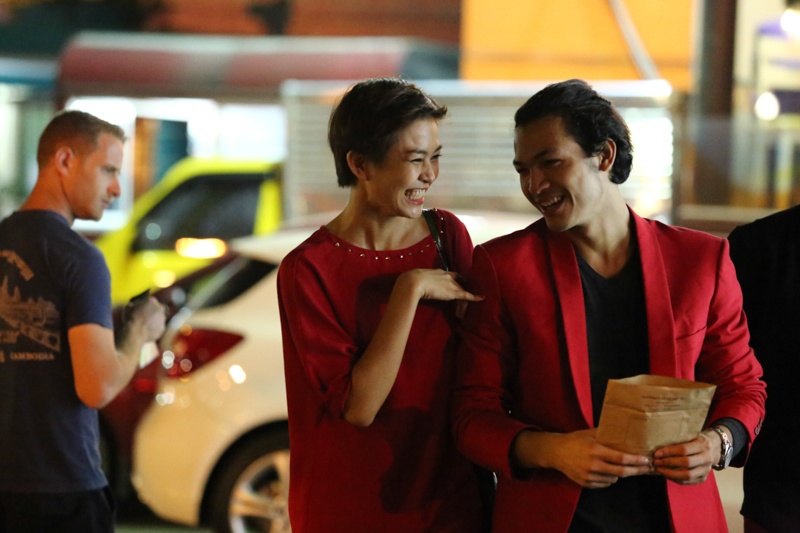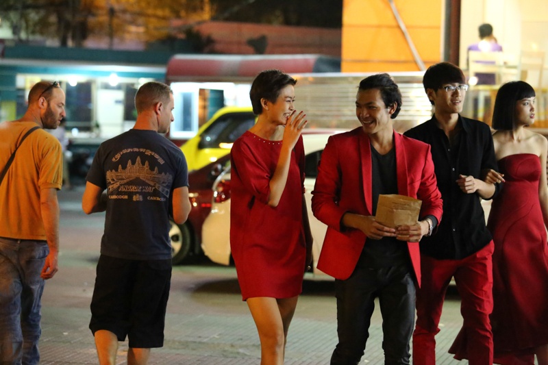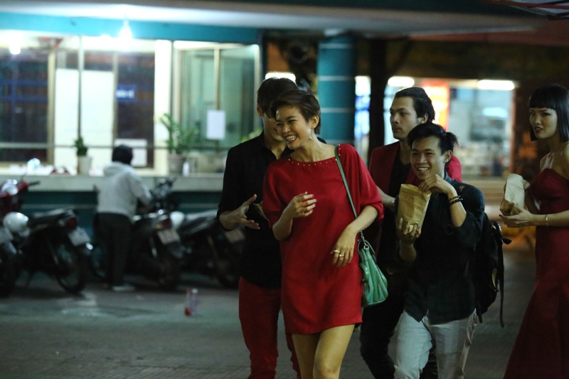 Cô cười nói vui vẻ cùng nhóm người mẫu và ê-kíp.