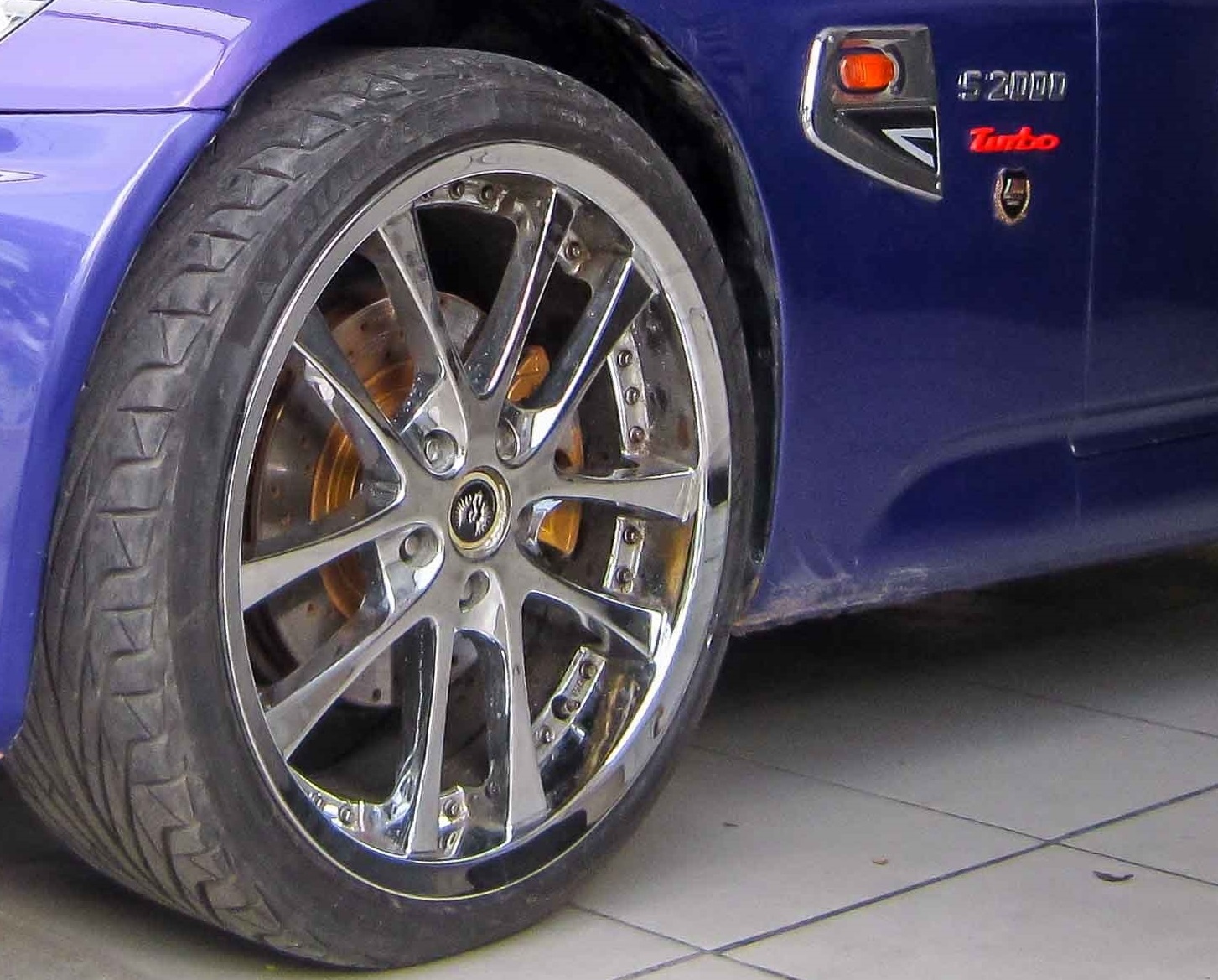 | Chiếc xe màu tím được chủ nhân độ vành mạ chrome sáng bóng. |