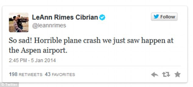 Ca sĩ LeAnn Rimes chia sẻ trên trang cá nhân: "Thật buồn. Chúng tôi vừa chứng kiến một vụ tai nạn máy bay kinh hoàng tại sân bay Aspen". Ảnh: Twitter.