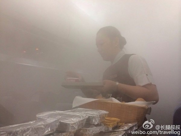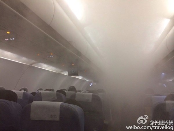 | Một loạt các hình ảnh xuất hiện trên mạng xã hội Trung Quốc cho thấy, "đám mây hơi nước" dày đặc phủ kín khoang hành khách trên chiếc máy bay ở đường băng sân bay quốc tế Thâm Quyến. |