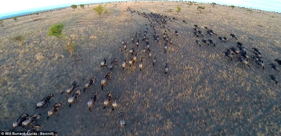 Máy bay không người lái của nhiếp ảnh gia Lucas dễ dàng chụp toàn cảnh cuộc di cư của loài linh dương đầu bò. BeetleCopter tạo ra rất ít tiếng ồn nên không làm xáo trộn cuộc sống của các loài động vật hoang dã trong quá trình quan sát. Ảnh: Will Burrard Lucas.
