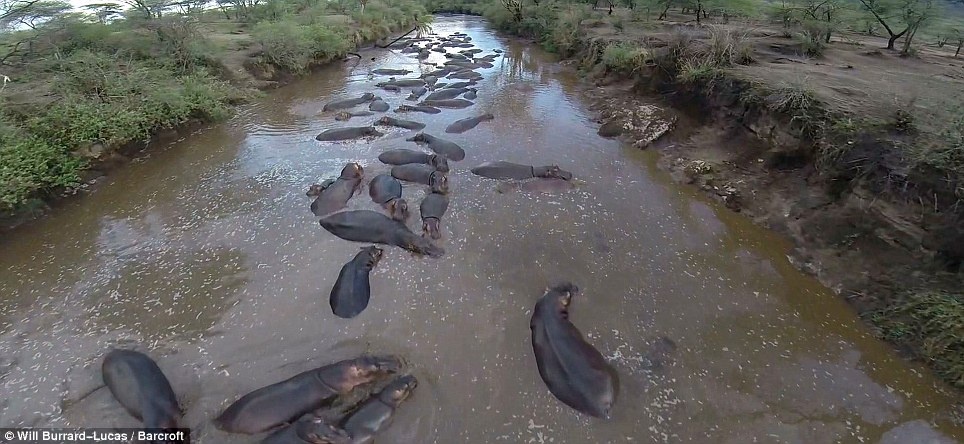 BeetleCopter chụp hình bầy hà mã bên dưới một khúc sông nhỏ. Lucas từng tốt nghiệp khoa kỹ thuật của một trường đại học Anh trước khi trở thành nhiếp ảnh gia động vật hoang dã. Hiện tại, anh sở hữu phi đội 8 chiếc BeetleCopter. Ảnh: Will Burrard Lucas.