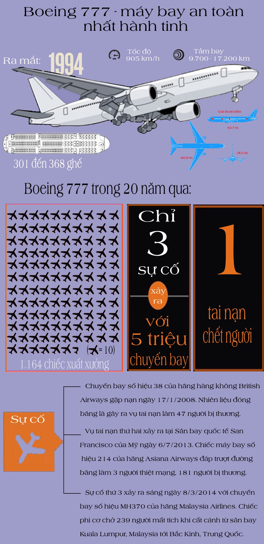 Không chỉ lớn và hiện đại hàng đầu, Boeing 777 còn là máy bay chở khách an toàn nhất thế giới, với chỉ 3 sự cố xảy ra trong gần 20 năm qua.