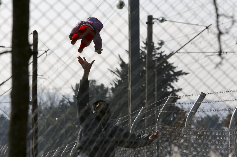 Một người cha đang chơi đùa với đứa con nhỏ khi chờ đợi được di cư từ Hy Lạp sang vào Macedonia. Bộ trưởng Hy Lạp phụ trách Chính sách nhập cư Yannis Mouzalas cho rằng việc đóng cửa biên giới với các nước vùng Balkan sẽ kéo theo "cuộc khủng hoảng nhân đạo lớn" ở Hy Lạp và không thể ngăn chặn dòng người di cư . |