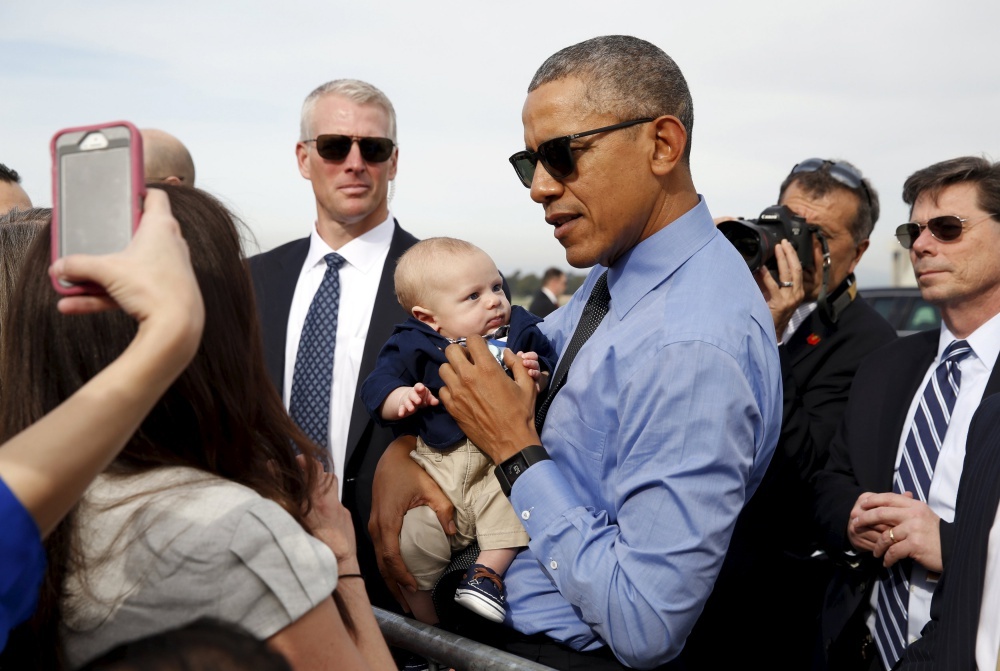 Tổng thống Barack Obama bế một em bé trước khi lên chuyên cơ Air Force One, khởi hành từ sân bay ở bang California. |