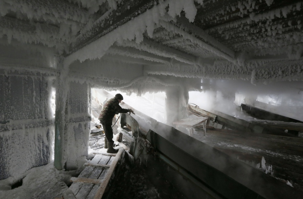 Một nhân viên đang làm việc tại nhà máy chế biến gỗ Novoyeniseisk ở vùng Krasnoyarsk, Siberia, Nga, khi nhiệt độ ngoài trời là âm 20 độ C. Họ làm việc quanh năm bất chấp điều kiện thời tiết lạnh giá, đôi khi chỉ âm 52 độ C . |