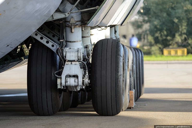 Để chịu được tải trọng khổng lồ, bộ bánh đáp của An-225 có tới 32 bánh, các kỹ sư hàng không Liên Xô đã thiết kế hệ thống giảm chấn thủy lực đặc biệt để hấp thu sức nặng của máy bay. Ảnh: Tuku.military.china.