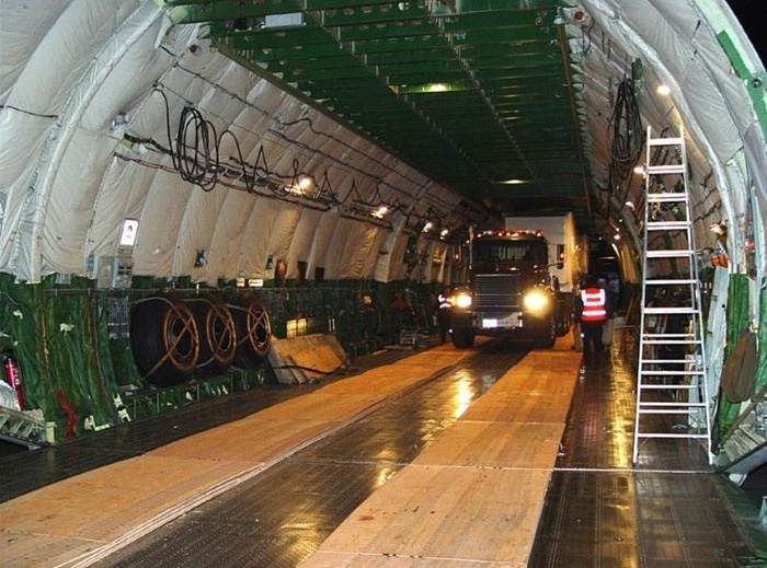 Khoang hàng hóa của An-225 có chiều dài 43,35 mét, rộng 6,4 mét, cao 4,4 mét. Khoang bao gồm hai đường ray hỗ trợ vận chuyển hàng hóa quá khổ, quá tải. Ảnh: Tuku.military.china.
