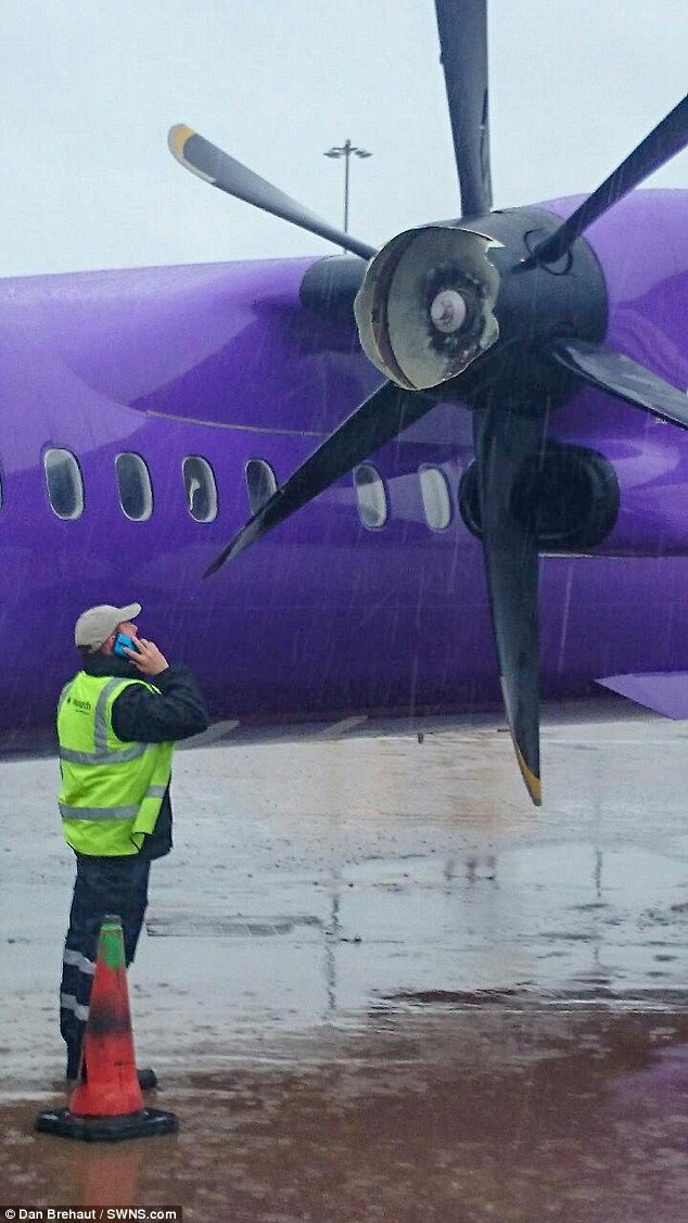 Hành khách ngồi ở dãy ghế bên trái chiếc Bombadier Dash-8 có thể quan sát động cơ cánh quạt bị hư hại và ngừng hoạt động sau cú va chạm với chim khi máy bay chở khách của hãng hàng không Flybe cất cánh từ sân bay Guernsey tới Birmingham, Anh. Tuy nhiên, thay vì cho máy bay tiếp đất, phi công vẫn tiếp tục hành trình và tới đích một giờ sau đó. |