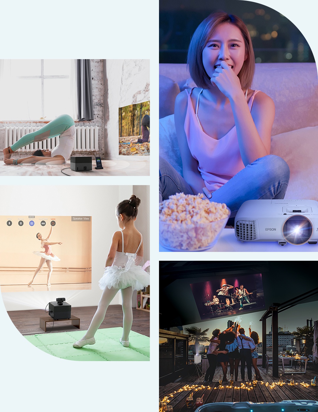 Như với dòng máy chiếu gia đình EpiqVision Mini EF-100B/W ATV và EpiqVision Mini EF-12 của Epson, bạn có thể tận dụng mọi không gian trống ở phòng khách hoặc phòng ngủ để trình chiếu tài liệu, hình ảnh, xem phim. Thiết bị này cũng được thiết kế gọn nhẹ để dễ dàng di chuyển đến khu vực bếp hoặc sân vườn - nơi bạn có thể vừa theo dõi video hướng dẫn, vừa nấu ăn, tập thể dục...