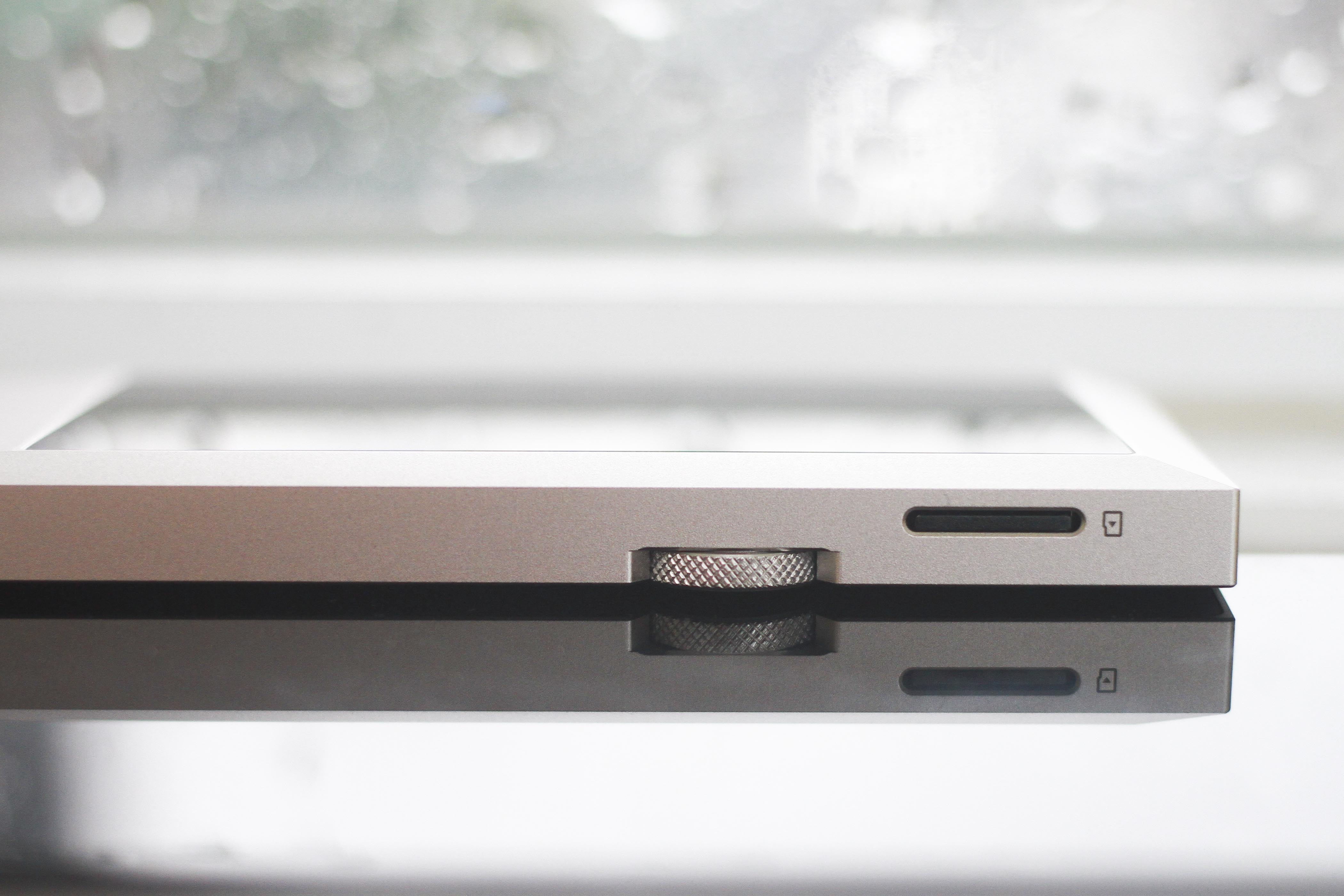 | Cạnh phải là khe cắm thẻ nhớ và nút điều chỉnh âm lượng. AK Jr chỉ hỗ trợ thẻ nhớ tối đa 64 GB, tương đương với dung lượng bộ nhớ trong. |