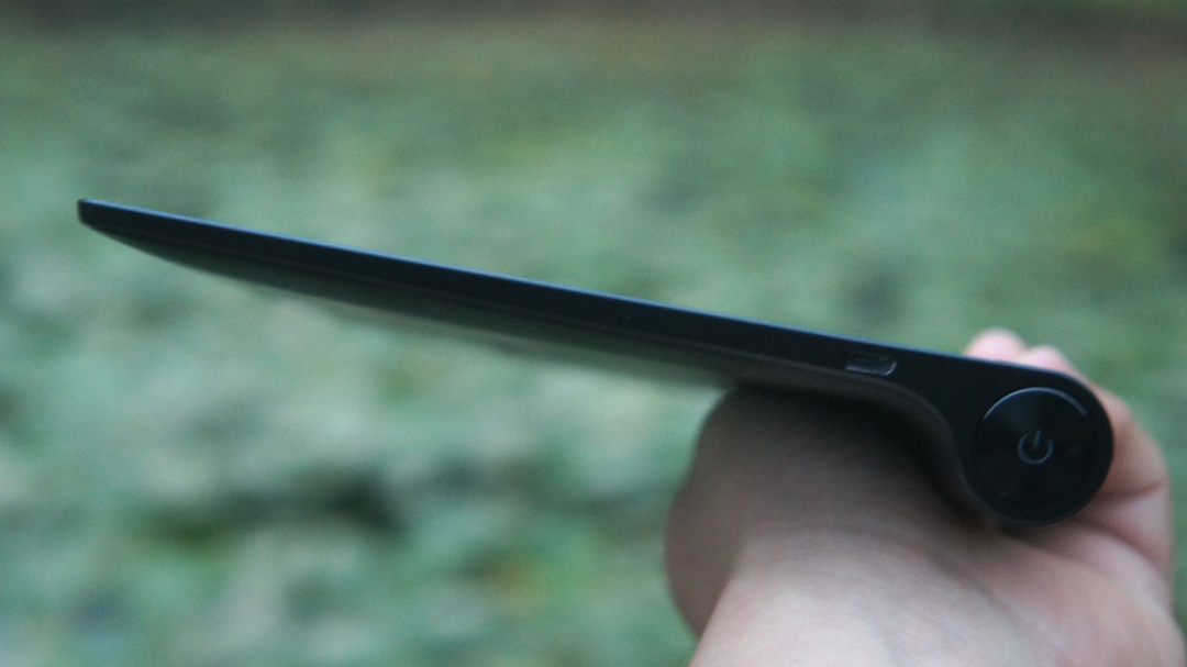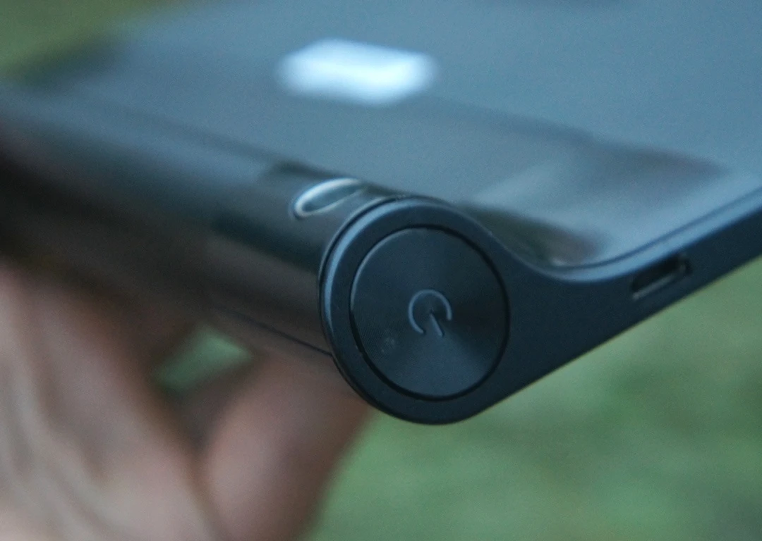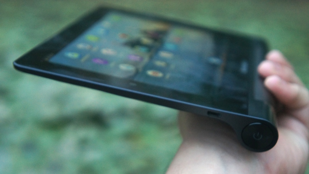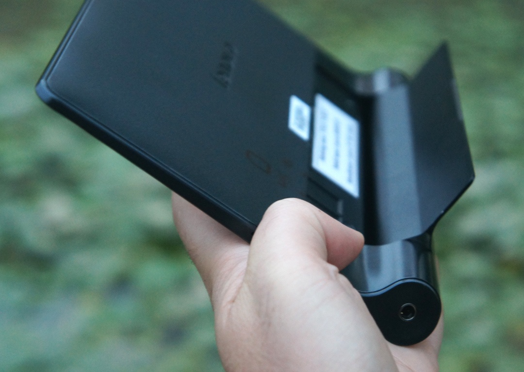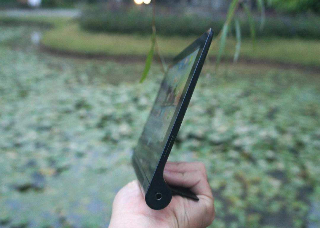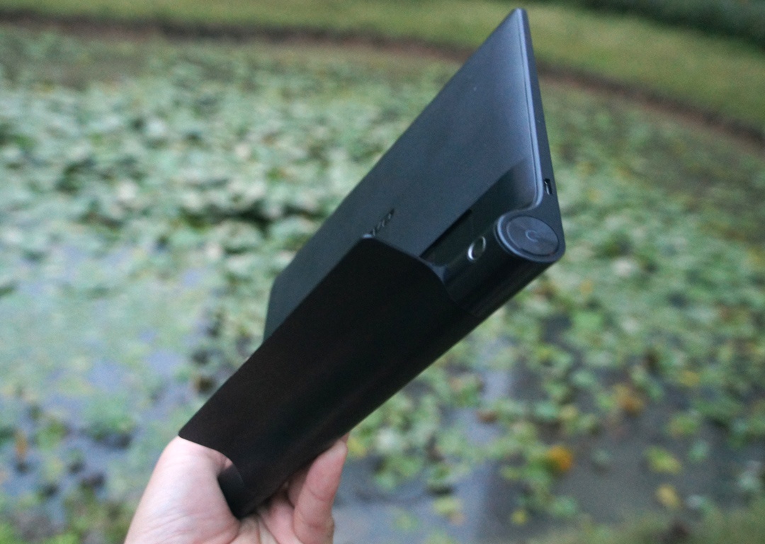 Phần cạnh bên của Lenovo Yoga Tablet 8 có thể đóng vai trò như một chân đế khi đặt ngang máy hoặc biến thành tay cầm khi bạn sử dụng theo chiều dọc.