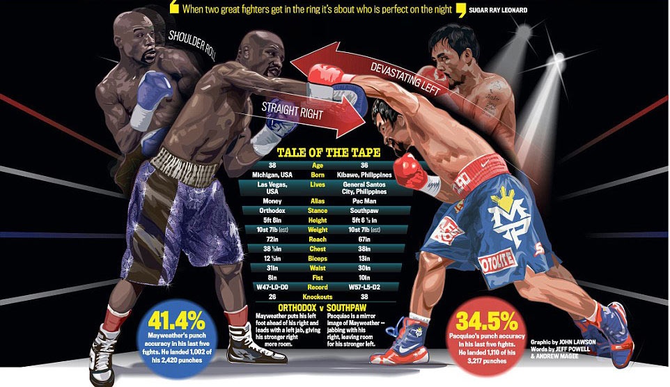 Trong khi đó, Foyd Mayweather được đánh giá cao ở khả năng phản đòn chính xác đạt tỷ lệ 41,4%. Khi tay đấm người Mỹ phòng thủ thường thả tay trái xuống và khép chặt vào vai. Sau khi đối phương ra đòn trượt, Mayweather đáp trả bằng cú đấm thẳng bằng tay phải. Tuy nhiên, võ sĩ người Mỹ rất khó để phòng ngự theo kiểu đó khi thi đấu với một đối thủ thuận tay trái như Pacquiao.